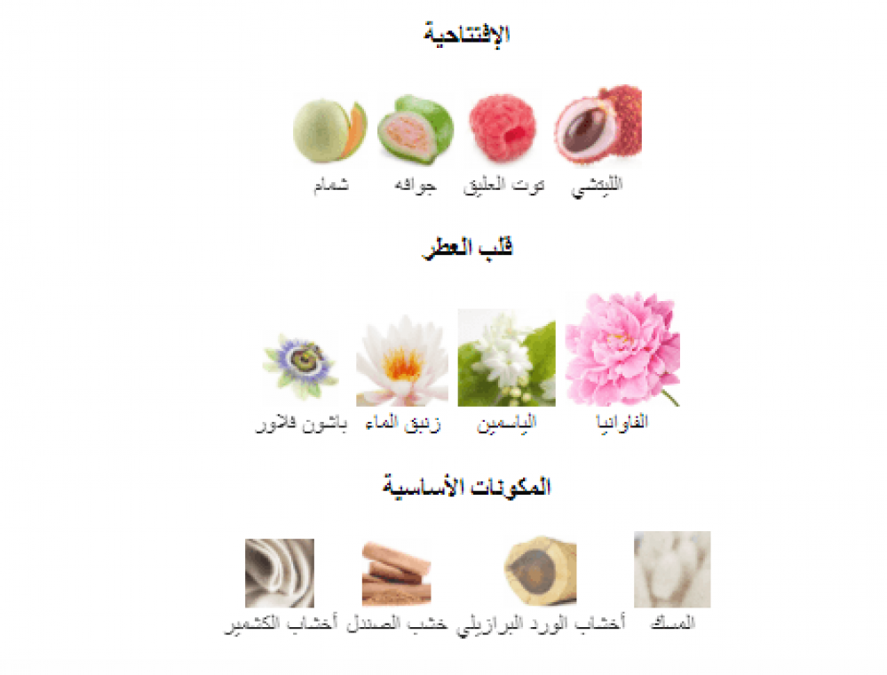 أفتتاحية العطر الشمام وتوت العليق والجوافة والليتشي قلب العطر : زهرة باشن فلور والياسمين الفاوانيا وزنبق الماء القاعدة : أخشاب الصندل والورد البرازيلي والكشمير والمسك